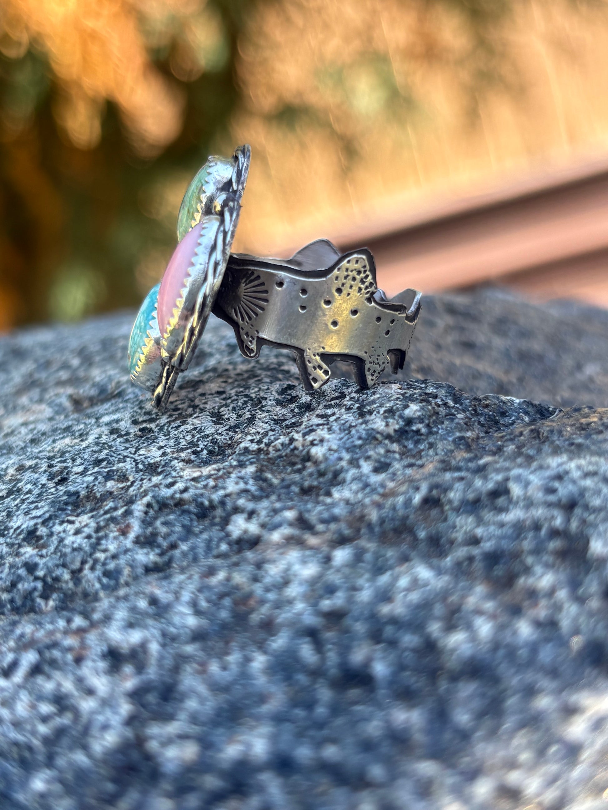 Sonoran Gold Turquoise, Pink Conch, and White Water Turquoise with a hand sawn trout band. Size 9.5.