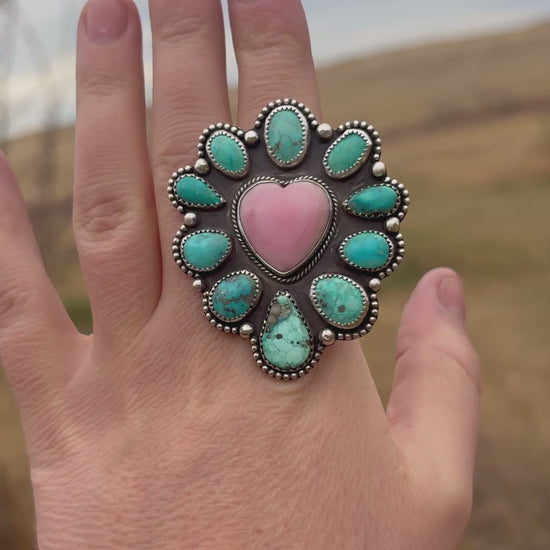 Pink Conch heart with mixed turquoise. Size 7.5.