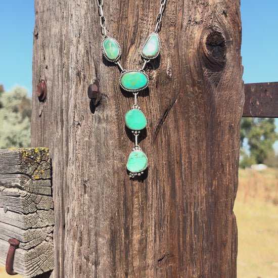 Mexican Turquoise lariat necklace. Chain is about 8 inches on both sides, 5 inches on both sides is handmade chain.